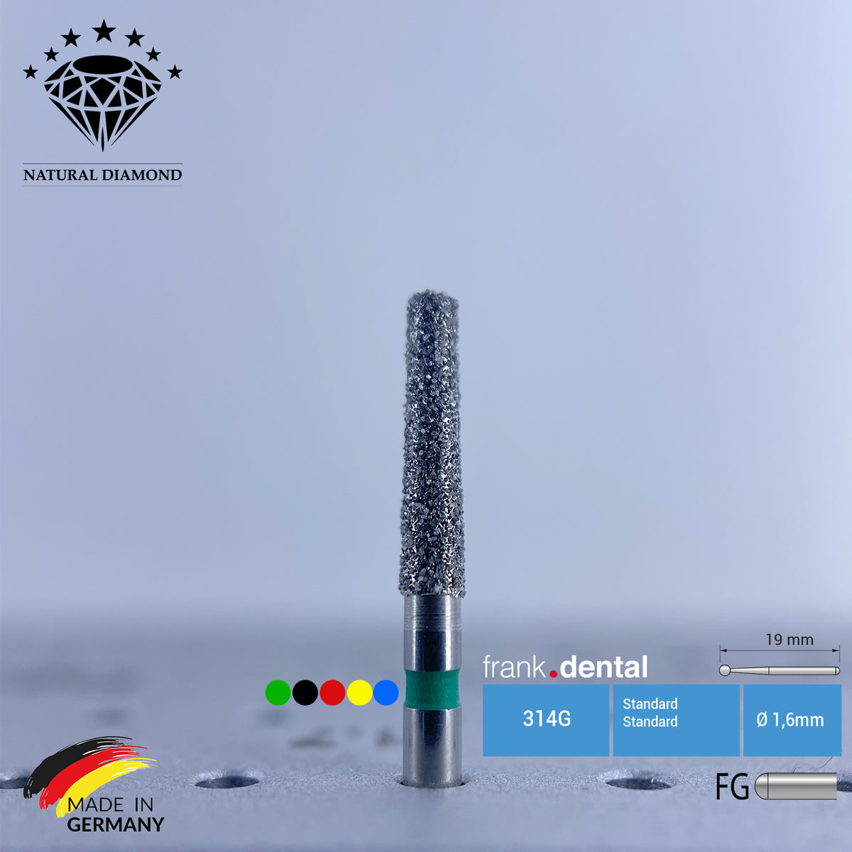 Diamond is the hardest natural material known to man and, therefore, is the material of choice when it comes to wearing down the hardest tissue in the human body: tooth enamel. Diamond burs have a steel shank and an active part coated with natural or synthetic diamond powder. The vast majority of commercially available dental burs are made of synthetic diamond, and it is less common to come across natural diamond burs. Manufacturers who use natural diamond usually emphasise this characteristic, as it gives the burs greater quality, efficiency, and durability. Of course, the cost of a natural diamond bur is higher than that of a synthetic diamond bur.