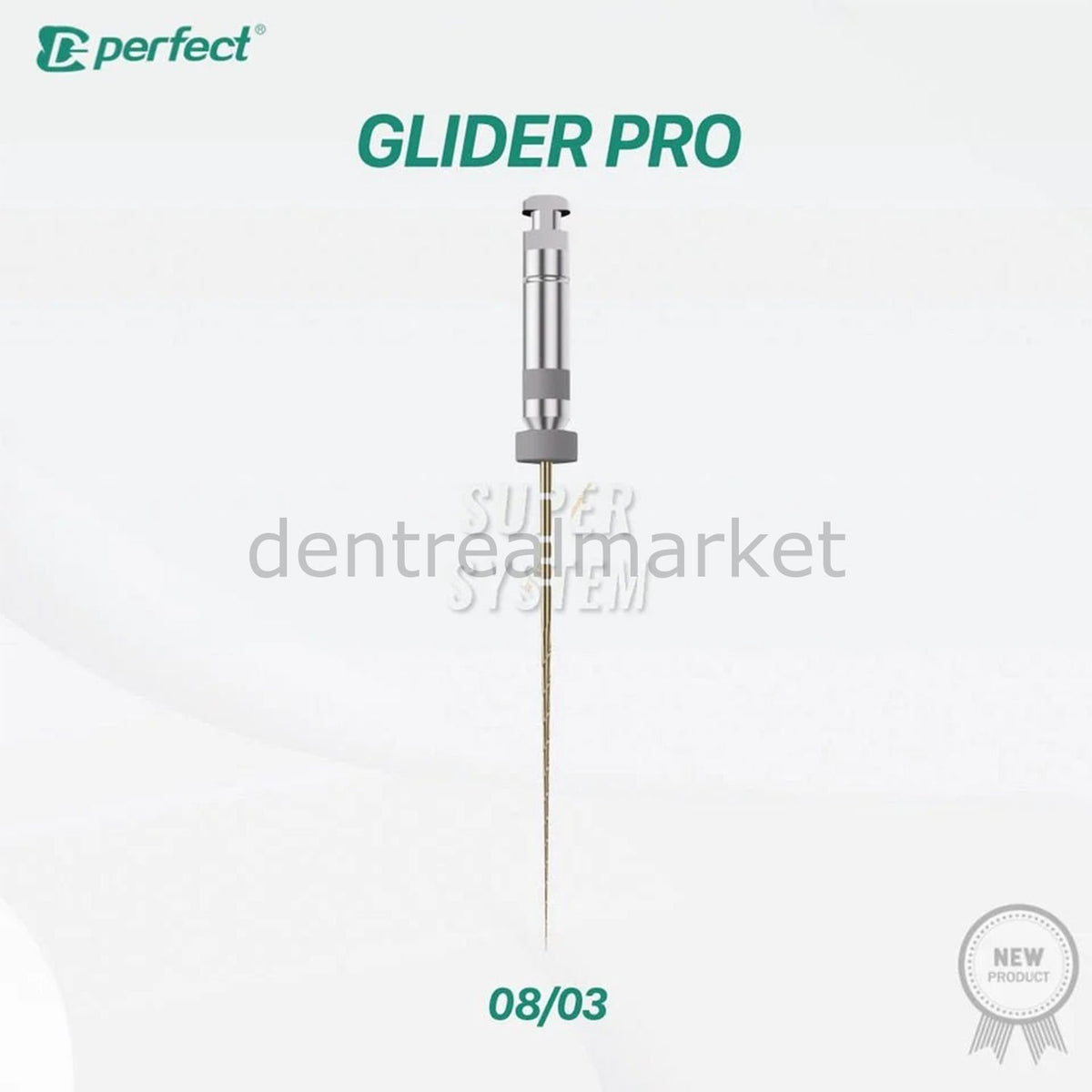 Perfect SUPER SYSTEM Glider Pro is an 8 mm wide, 0.03 taper, gold heat-treated NiTi root canal file.
