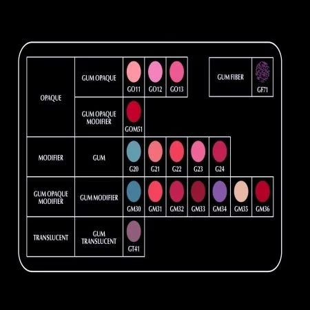 Dentine : permet une adaptation des couleurs dans toutes les situations. Doux et facile à façonner. Grâce à sa structure micro-hybride, il présente la particularité de refléter et de distribuer correctement la lumière. Correspondance parfaite des couleurs.