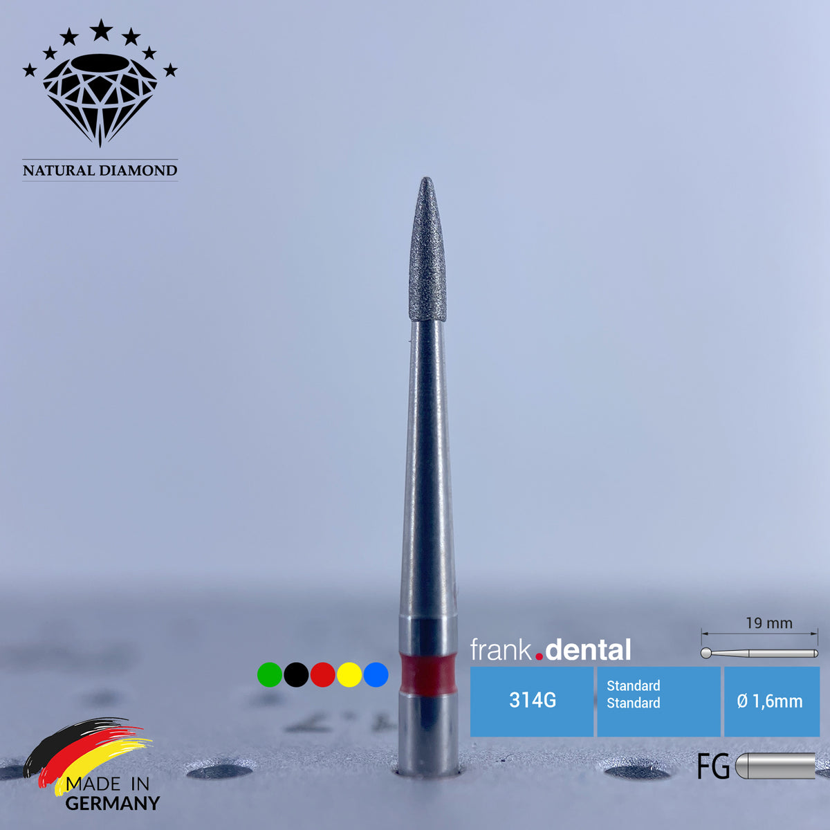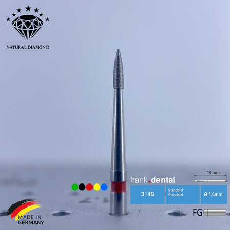 Diamanten gelten allgemein als das härteste natürliche Material und sind daher die erste Wahl für die Bearbeitung des härtesten Gewebes im menschlichen Körper – des Zahnschmelzes . Diese Dentaldiamantbohrer sind mit einem robusten Stahlschaft und einer mit Diamantpulver beschichteten Schneidfläche ausgestattet, das aus natürlichen oder synthetischen Quellen stammen kann.
