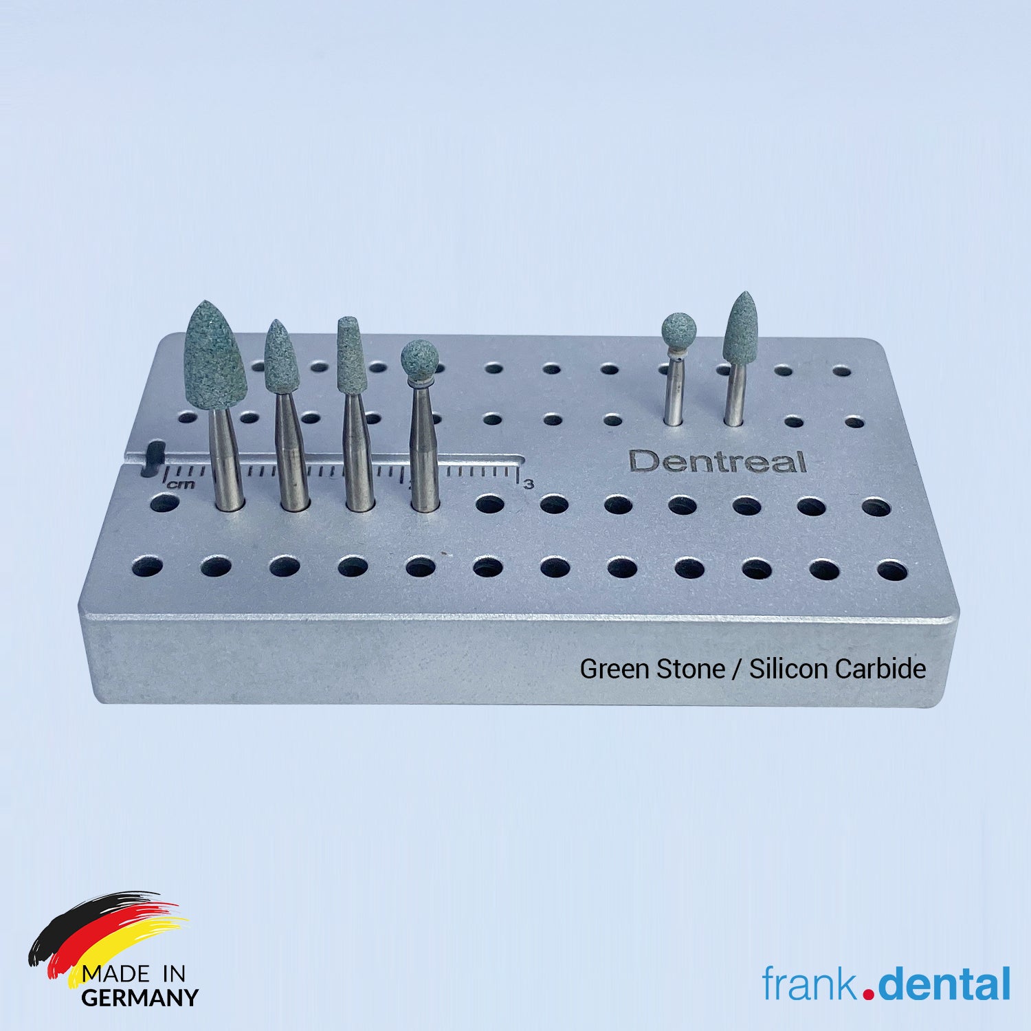 Das Green Stone Polierbohrer-Set ist für die schnelle Konturierung und Endbearbeitung verschiedener Dentalmaterialien wie Porzellan, Komposit, Kompomere, Gold, Silber und Amalgam konzipiert. Diese Bohrer mit Siliziumkarbidkörnung ermöglichen effizientes und präzises Polieren und sorgen für glatte Oberflächen und optimale Endbearbeitungen bei restaurativen Zahnbehandlungen.