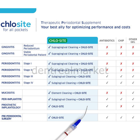 Chlo-Site is a xanthan-based, dual-form chlorhexidine bioadhesive gel designed for subgingival application in periodontal therapy. Developed for long-lasting, controlled release, it is used as an adjunct to mechanical debridement (SRP) in the treatment of periodontal and peri-implant conditions.