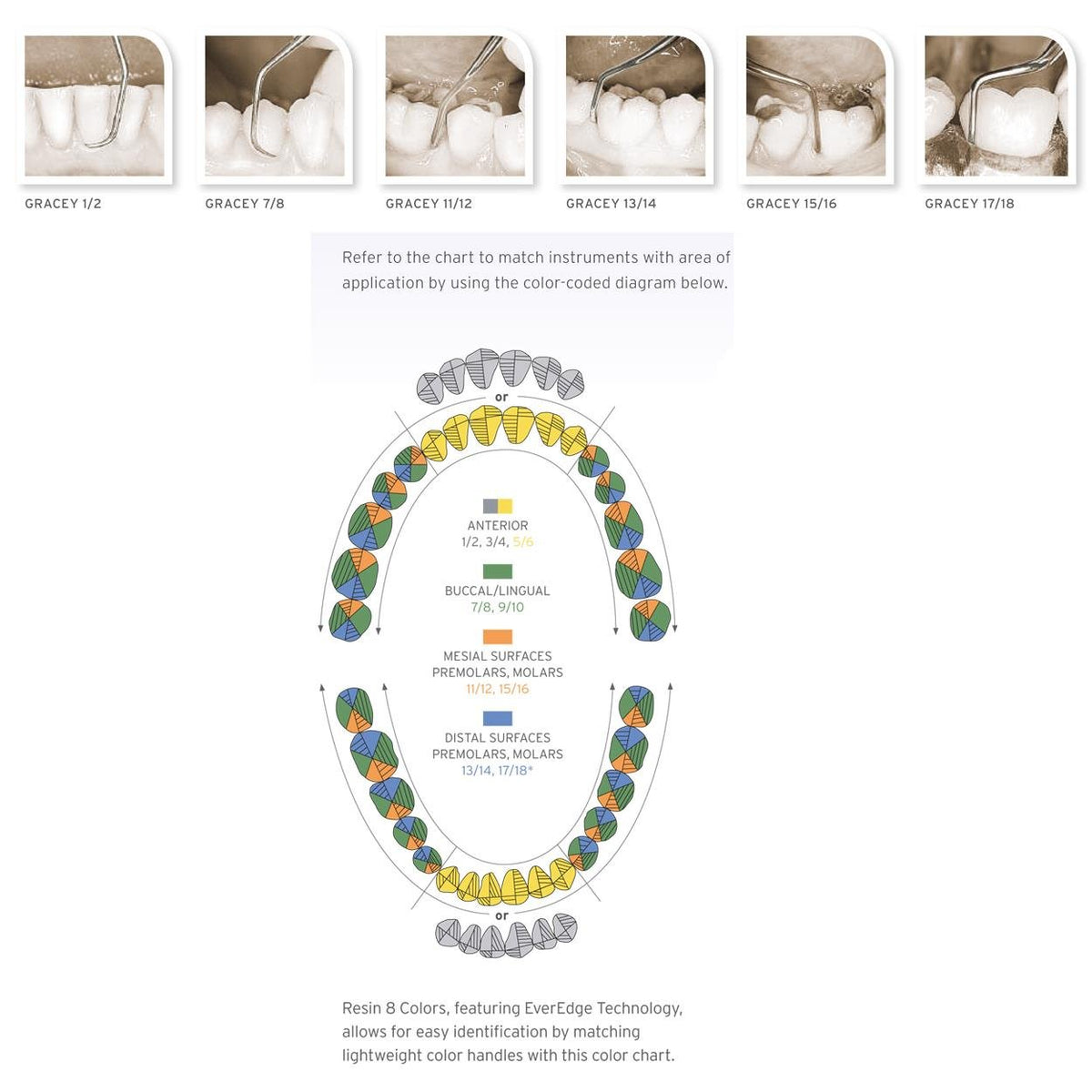 Für die distale Oberfläche der hinteren Zähne. Zur Entfernung von subgingivalem Zahnstein und zur Wurzelreinigung. Gracey-Küretten sind die beliebtesten und gebräuchlichsten und weniger traumatisch als die Universal-Kürette. Sie sind ortsspezifisch, da sie so konzipiert und sortiert sind, dass sie sich an den spezifischen zu behandelnden Bereich oder die Zahnoberfläche anpassen. Die Klinge der Gracey-Kürette ist um 70° vom Endschaft versetzt und nur auf einer Seite scharf. 13-14 Distale Flächen, Molaren und Prämolaren. Edelstahlgriffdurchmesser 10 mm. .