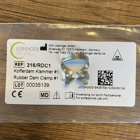 Der Kofferdam wird mithilfe einer Metallklammer um die Zahnkrone herum verankert, um die Kofferdamfolie an dem oder den Zähnen abzudichten und zu befestigen, die während des zahnärztlichen Eingriffs behandelt werden. Die Klammern sind in verschiedenen Formen und Größen erhältlich, die der Anatomie der verschiedenen Zähne im Mund entsprechen.